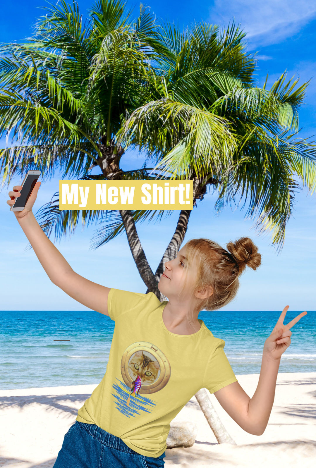 Lustiges Katzen & Stand Up Paddle T-Shirt. Niedliche & coole Katze beobachtet einen Stand Up Paddling Fisch auf einem SUP Board durch ein Bullauge. Witziges paddleboarding Shirt als Geschenk / Geschenkidee für Kinder & Erwachsene, die SUP, Stand Up Paddling, Fische, Angeln und Katzen lieben. Das Stand Up Paddle / Katzen T-Shirt ist in verschiedenen Farben und Größen für Kinder & Damen / Herren erhältlich. Translate to: ![]()